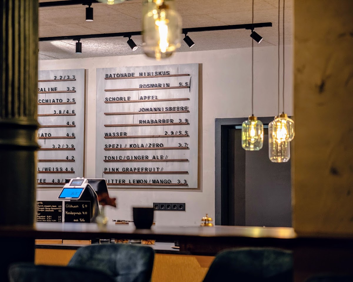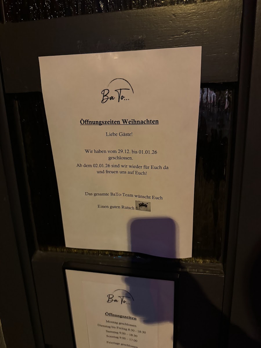 The menu at BaTo Cafe offers a variety of options suitable for breakfast, coffee breaks, and light meals. Visitors can find a selection of coffee and specialty drinks including lattes and iced beverages. Light food choices include sandwiches, focaccias, and different types of rolls. Desserts are also available, with items such as Kirschkuchen and Sacher highlighted on the menu.